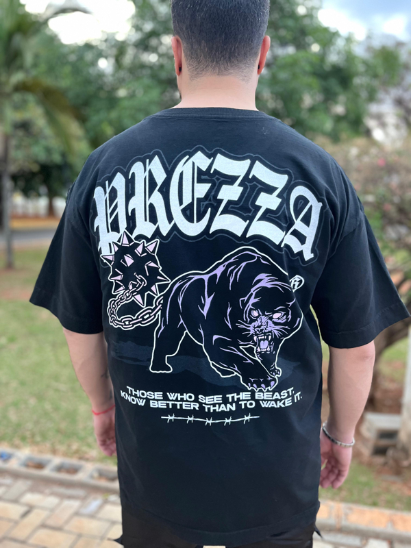 Camiseta Oversized Pantera disponÃvel do PP ao XG Com uma modelagem Oversized exclusiva, ela passa por um processo de amaciamento e pré encolhimento, deixando um toque muito macio e uma qualidade única . Essa obra divina, conta com uma malha grossa e robusta, proporcionando um caimento sem igual. Confeccionada com malha 100% algodão.